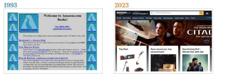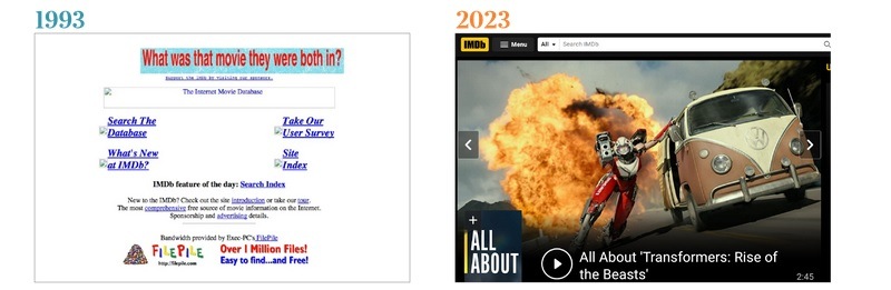 Já em 1993, os usuários podiam procurar informações sobre filmes e atores em um site de fãs que funcionava nos servidores do Departamento de Ciência da Computação da Cardiff University e mais tarde ficou conhecido como IMDb. Nesse mesmo ano, os usuários puderam pesquisar livros e ler resenhas na página inicial monótona e cheia de texto da Amazon. No final de 1998, o mecanismo de busca Google tinha cerca de 60 milhões de páginas em seu índice. Iniciado como um projeto de pesquisa por dois estudantes, Sergey Brin e Larry Page, o site se tornou o mecanismo de busca mais popular do mundo.