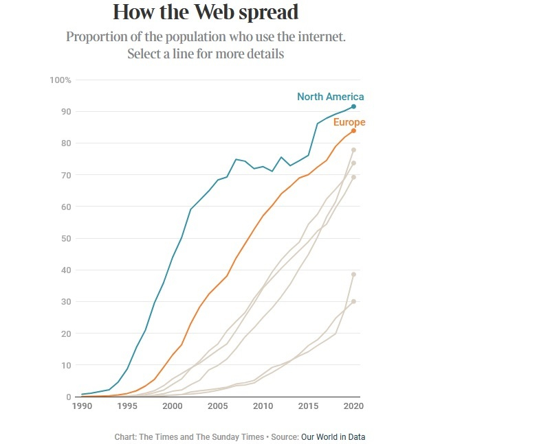 Na década de 1990, os sites apresentavam principalmente texto e imagens estáticas. O acesso à Internet era lento e as animações e a interatividade eram severamente limitadas. Na virada do novo milênio, 44% dos norte-americanos estavam usando a Internet. Somente nas últimas duas décadas esta rede se tornou verdadeiramente global, já que a porcentagem de usuários aumentou dramaticamente em todas as regiões, incluindo América Latina, Oriente Médio, Norte da África, etc. Hoje, 64% dos habitantes do mundo são Usuários de Internet, que é de aproximadamente 5,16 bilhões de humanos.