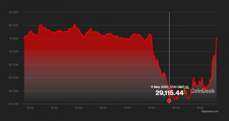 Após a queda, a criptomoeda perdeu cerca de 5% de seu valor, mas se recuperou em poucos minutos. No momento, seu preço caiu para US$ 29,1 mil por unidade, o menor desde julho de 2021. No momento da redação da notícia, o token quase completamente recuperou a queda, retornando ao nível de US$ 31,3 mil.