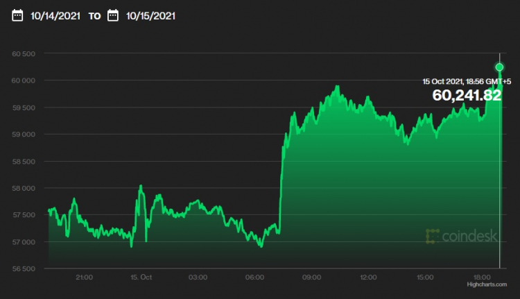 O preço do bitcoin ultrapassou a marca de US $ 60 mil – este é o valor mais alto desde abril deste ano. Isso é evidenciado pelos dados do portal Coindesk, que coleta dados sobre as taxas de criptomoeda de diferentes bolsas.