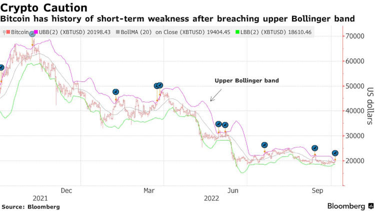 As criptomoedas estão cada vez mais integradas à estrutura das bolsas de valores, obedecendo às leis dos títulos tradicionais. Desde o início do ano, o Bitcoin perdeu 56% de seu valor e agora está se comportando de maneira bastante previsível, atuando dentro das Bollinger Bands – essa é uma maneira popular de analisar a volatilidade. Ele rompeu a banda de Bollinger superior na última sessão de crescimento e, quando o fez anteriormente, caiu em média 12% nos próximos 20 dias.