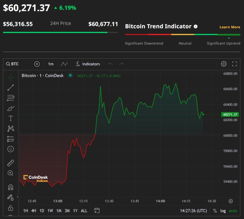 O Bitcoin subiu para US$ 60.000 pela primeira vez desde que atingiu o máximo histórico de quase US$ 69.000 em novembro de 2021. A maior criptomoeda subiu mais de 40% só este ano, graças em parte ao lançamento bem-sucedido de fundos negociados em bolsa (ETFs) à vista dos EUA, que levantaram mais de US$ 6 bilhões desde o início das negociações em 11 de janeiro, e em parte devido ao próxima redução pela metade, após a qual as recompensas por bloco minerado serão reduzidas pela metade, de 6,25 para 3,125 bitcoins.