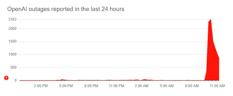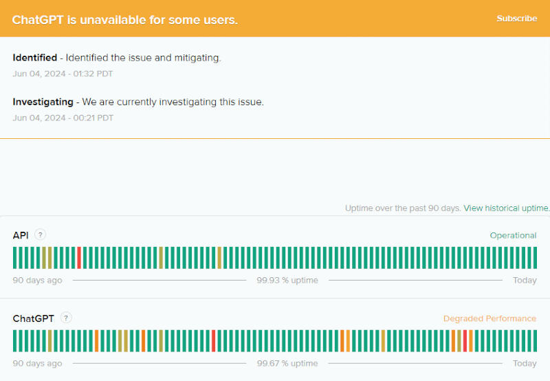 O serviço de monitoramento de falhas de serviços Web DownDetector mostra que problemas de acesso aos recursos OpenAI são observados em todo o mundo. A própria página de status do ChatGPT confirma que o serviço está indisponível para alguns usuários, e os motivos da falha estão sendo estudados – afirma também que nos últimos 90 dias o uptime do ChatGPT foi de 99,67%.