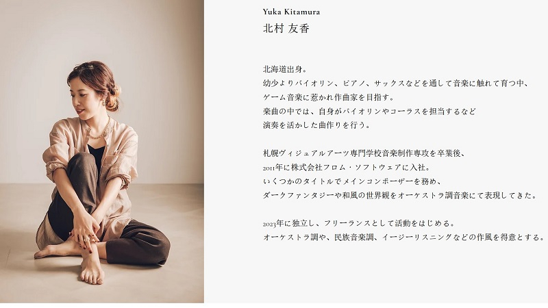 O portal inclui uma breve biografia de Kitamura, uma lista de seus trabalhos anteriores e várias faixas demo. O compositor é especialista em música orquestral, étnica e leve.