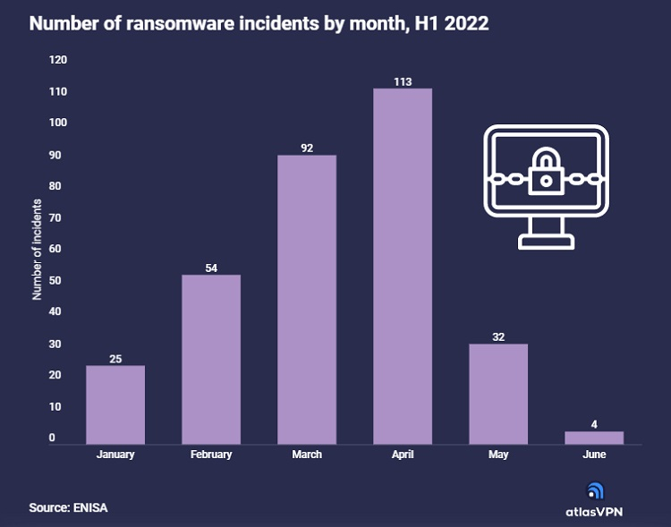 Embora muitos hackers pareçam ter saído de “férias”, alguma atividade de ransomware permanece. No primeiro semestre de 2022, as empresas foram afetadas por 320 incidentes de ransomware. O número de incidentes é muito diferente de mês para mês, seu número também caiu significativamente com o início do verão. Por exemplo, em junho, houve apenas 4 casos significativos de ataques de ransomware nessas regiões.