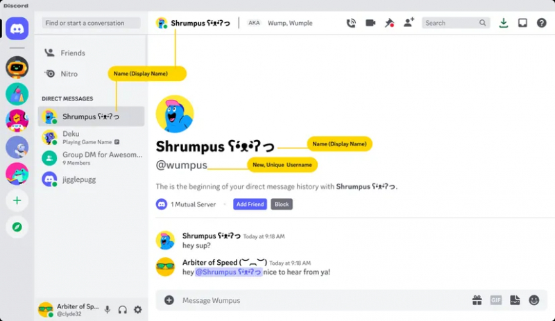 Conforme informado no blog da empresa, essa mudança obrigará a maioria dos usuários a mudar de nome, já que o Discord não terá mais uma etiqueta de quatro dígitos que distingue uma pessoa com o mesmo apelido de outra. Em vez de um código de quatro dígitos, os usuários agora terão um nome alfanumérico exclusivo com um caractere “@” na frente.