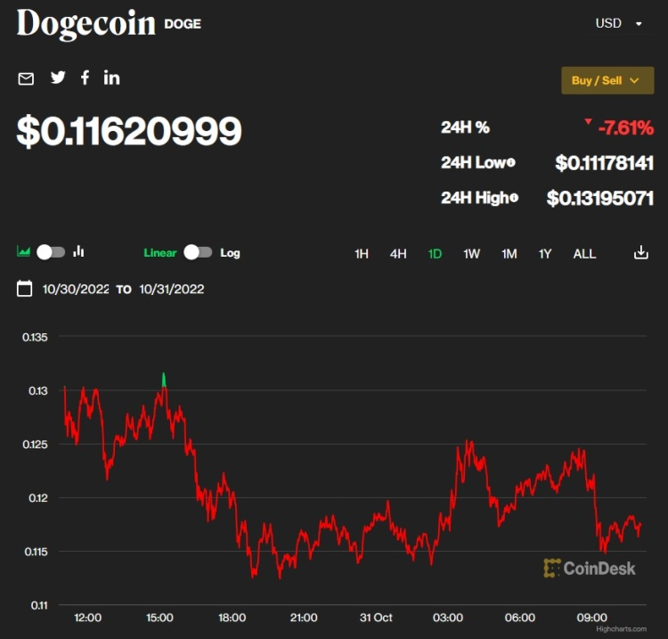 A criptomoeda Dogecoin subiu mais de 70% no fim de semana, ajudada pela notícia da compra da rede social Twitter pelo bilionário Elon Musk, que é defensor dos ativos digitais. De acordo com a plataforma CoinDesk, o Dogecoin caiu de preço em mais de 7% no último dia. No momento da redação desta nota, uma unidade de criptomoeda custava cerca de US$ 0,11.