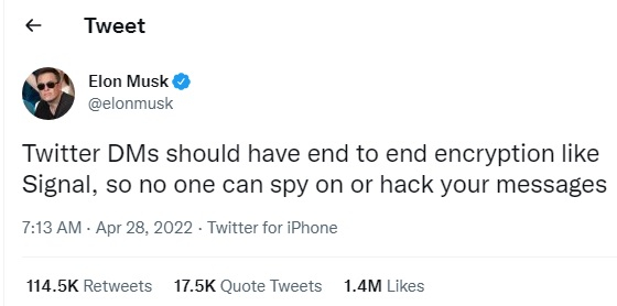 «As mensagens privadas do Twitter devem ser criptografadas de ponta a ponta, como o Signal, para que ninguém possa espionar você ou invadir mensagens”, disse Musk em um tweet recente.