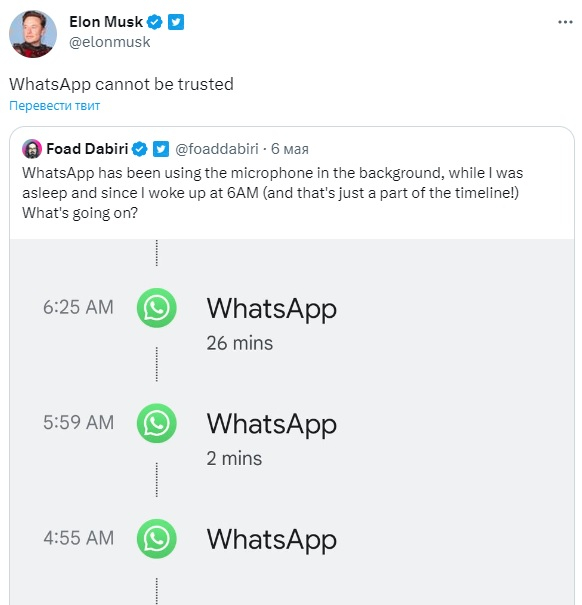 Quando o usuário do messenger e funcionário do Twitter Foad Dabiri reclamou que seu aplicativo estava ativando o microfone com frequência – mesmo quando a pessoa estava dormindo, o próprio Musk respondeu ao tweet, afirmando literalmente: “O WhatsApp não é confiável”.