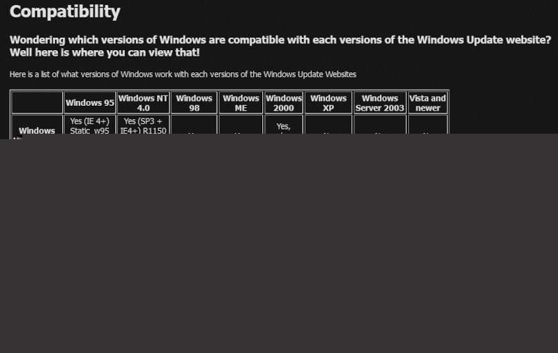 O site de atualização está atualmente limitado a um clone do recurso Windows Update v3.1 (1997), que abrange Windows 95, NT 4.0 e Windows 98 (incluindo a versão SE). Os criadores do site observam que este não é um projeto oficial, assim como as páginas de atualização a que se refere. Eles alertam que usam essas páginas por sua conta e risco e também enfatizam que os service packs são “apenas para fins de arquivamento”. No entanto, o vídeo abaixo mostra que este site é usado para atualizar o sistema operacional.