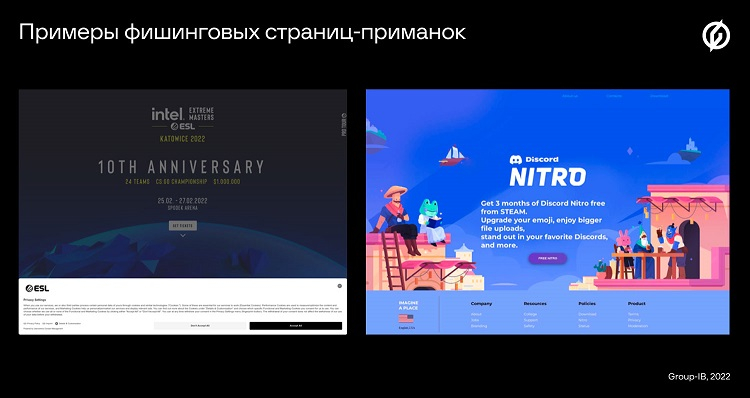 Para atrair os jogadores para uma página de isca, os golpistas usam chats e comunidades temáticas (convites para torneios de e-sports, votação, compra de ingressos e recebimento de prêmios), além de publicidade em vídeos populares.