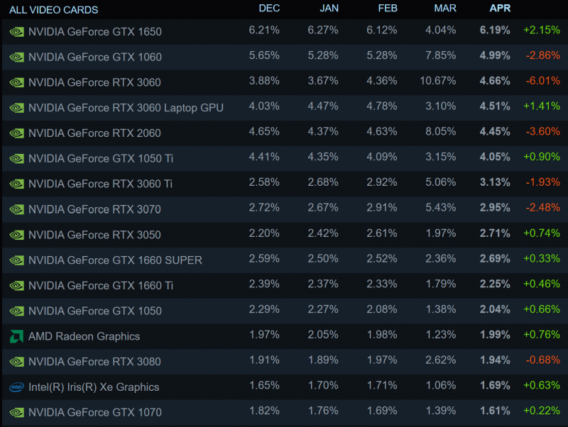 Em março, a quota de proprietários de GeForce RTX 3060 subiu para 10,67%, um aumento de 6,31 pontos percentuais (p.p.), que ultrapassou o modelo GeForce GTX 1650, que ocupava o primeiro lugar no ranking de estatísticas Steam desde novembro do ano passado, em popularidade . No entanto, em abril, a situação mudou drasticamente na direção oposta. A GeForce RTX 3060 perdeu 6,01 p.p. no último mês. A participação total de usuários desta placa de vídeo na plataforma caiu para 4,66%, com o que a placa voltou à terceira linha de popularidade no Steam. A GeForce GTX 1650 voltou ao primeiro lugar com 6,19% de share.