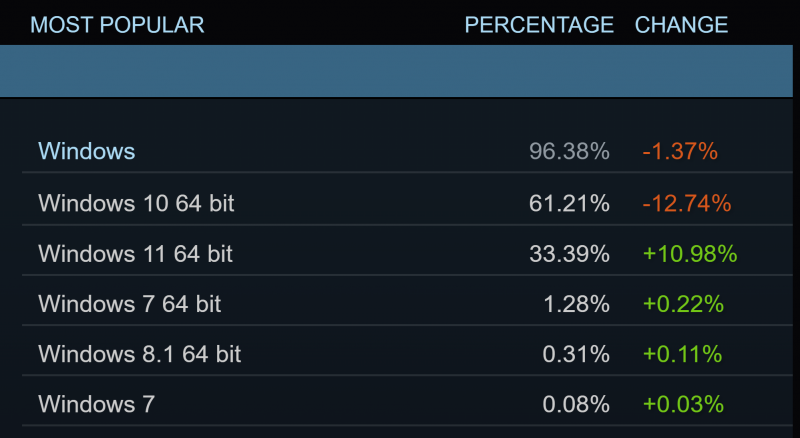 Sistema operacional Windows 10 (64 bits), que aumentou a participação de usuários em março em 11,62 p.p. perdeu 12,74 p.p. em abril Como resultado, a diferença com o Windows 11 diminuiu, cuja popularidade aumentou 10,98 pontos percentuais no mês passado, e a participação total de usuários desse sistema operacional aumentou para 27,82%.