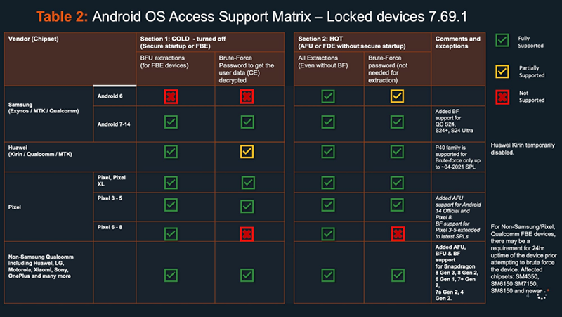 Além disso, outro arquivo Cellebrite Android Support Matrix menciona que a Cellebrite pode desbloquear a maioria dos dispositivos Android, mas a força bruta e outros métodos não funcionarão em um Google Pixel 6, 7 ou 8 desativado.