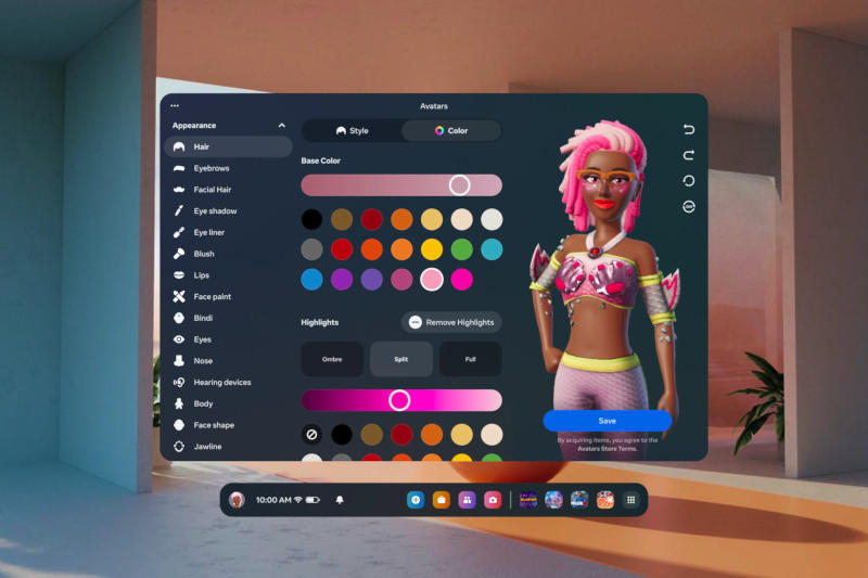 A empresa publicou uma captura de tela da versão atualizada do aplicativo, que mostra controles deslizantes que ajudam você a escolher um tom para a cor do seu cabelo – a versão anterior do software Meta✴ Quest só permitia escolher entre um conjunto pronto de cores, sem permitir que você ajuste as cortinas. Existem também várias novas opções de maquiagem disponíveis: Você pode aplicar blush ou pintura facial no rosto do avatar. Recentemente, alguns usuários da plataforma virtual puderam ver pernas de avatares.