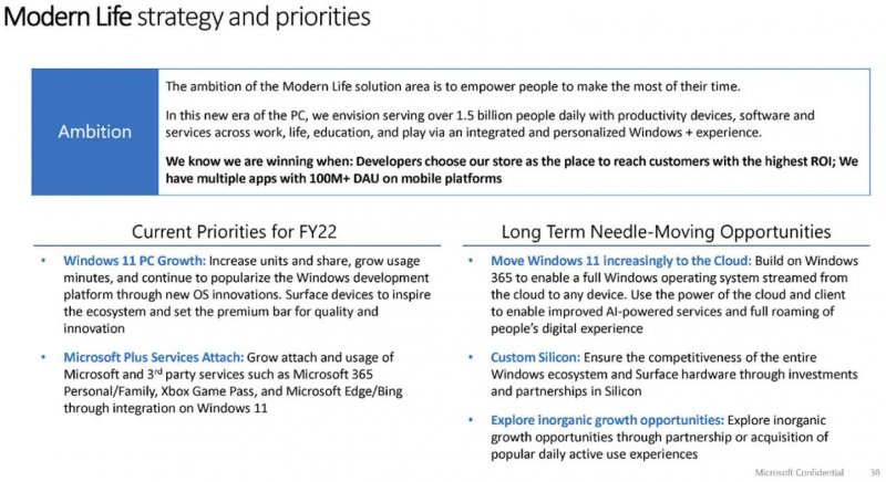 A apresentação foi tornada pública como parte da audiência FTC (Federal Trade Commission) v. Microsoft porque inclui a estratégia geral de desenvolvimento para a divisão de OS e seu relacionamento com outras partes dos negócios da empresa. Mover cada vez mais o Windows para a nuvem é definido como uma meta de longo prazo para a empresa no segmento de consumo. Com nuvens poderosas e inteligência artificial, a Microsoft planeja mudar completamente a forma como as pessoas interagem com seu sistema operacional. O sistema operacional pode ser executado a partir de qualquer dispositivo e em qualquer lugar onde haja Internet.