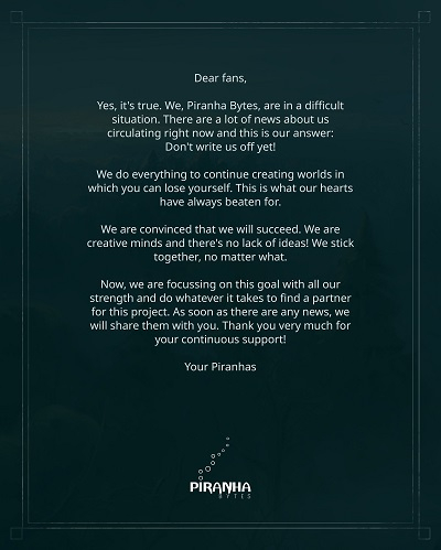 Em primeiro lugar, a Piranha Bytes confirmou que se encontrava numa “situação difícil”, mas não perdeu as esperanças: “Há muitas notícias a circular à nossa volta, e aqui está a nossa resposta: não se apresse em nos descartar!”