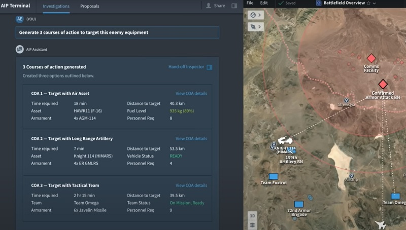 No vídeo de demonstração, o operador do sistema detecta as forças inimigas e pede ao assistente de IA que envie drones de reconhecimento, prepare opções para possíveis respostas táticas à ameaça e até mesmo organize o bloqueio de rádio das comunicações prioritárias. O AIP ajuda a avaliar as forças e capacidades inimigas com a ajuda do drone Reaper e sugere possíveis respostas, levando em consideração o número de armas leves antitanque disponíveis para cada unidade.