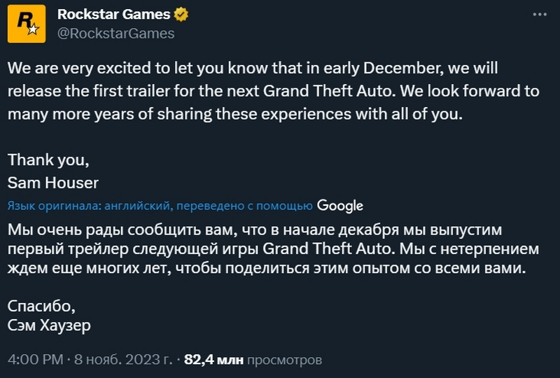 A empresa planeja lançar um trailer do novo jogo em dezembro, de acordo com uma postagem na rede social X (antigo Twitter) em nome do presidente da Rockstar, Sam Houser. O vídeo promocional do jogo será dedicado ao 25º aniversário da Rockstar. O nome da próxima parte do jogo ainda não foi finalizado, mas os fãs estão chamando-a de GTA VI ou GTA 6.