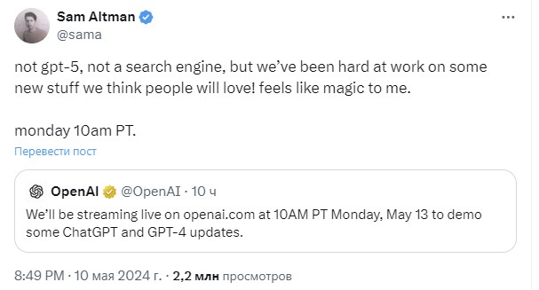 Altman também retuitou uma mensagem do canal oficial OpenAI, que afirma que a empresa falará sobre novas atualizações para o chatbot ChatGPT e o modelo de linguagem GPT-4 na segunda-feira às 10h, horário local (20h, horário de Moscou).