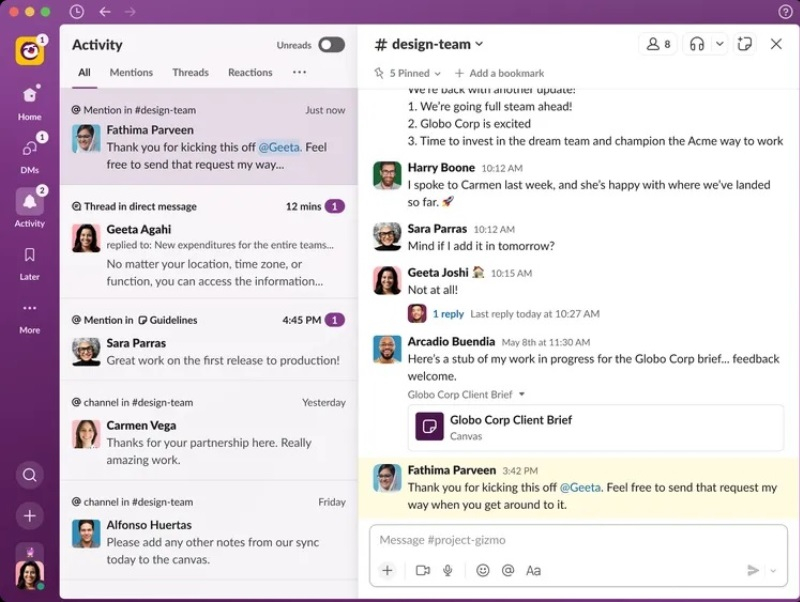 Mais adiante na barra lateral está a guia Atividade, que os desenvolvedores chamam de “caixa de correio unificada”. Esta é uma coleção de todas as postagens, menções e reações a postagens de todos os workspaces do Slack dos quais o usuário é membro. Espera-se que as informações reunidas nesta seção ajudem os usuários a começar o dia de forma mais produtiva.