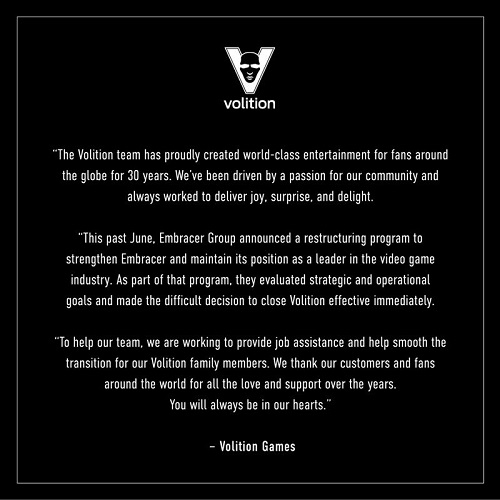 Sobre o destino decepcionante da Volition, ela se anunciou em seu site. O estúdio não se enquadrava nos objetivos estratégicos e operacionais da Embracer, por isso foi tomada a “difícil decisão de fechar a Volition imediatamente”.