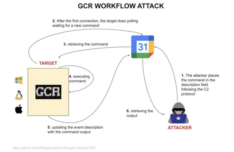 A técnica, chamada Google Calendar RAT (GCR), envolve colocar comandos C2 na descrição dos eventos do calendário. O malware instalado por hackers pode verificar regularmente sua conta do Google Agenda em busca de novos comandos e executá-los no dispositivo infectado.