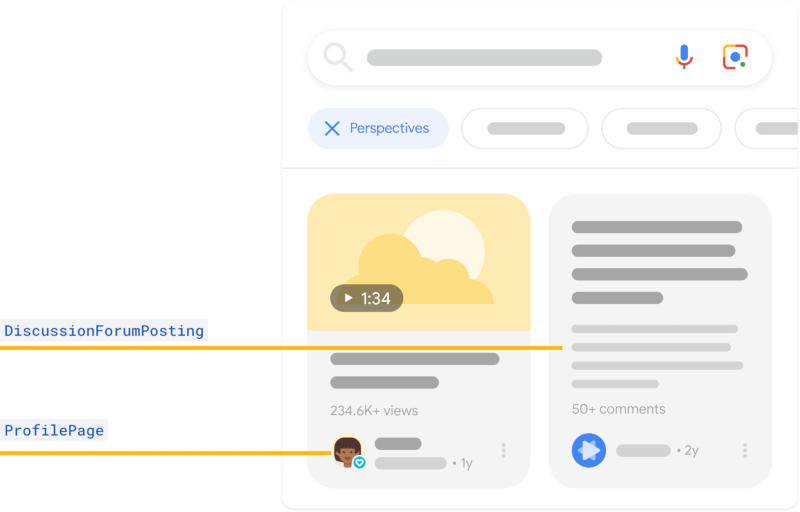 Anteriormente, o Google introduziu o filtro Perspectivas – ele destaca postagens de fóruns, sites de perguntas e respostas e redes sociais nos resultados de pesquisa. O recurso estreou em dispositivos móveis e posteriormente migrou para a versão desktop da busca. A empresa atualizou seu algoritmo de classificação para aumentar a presença de “opiniões em primeira mão” e ofereceu ferramentas para ajudar os mecanismos de busca a entender como os dados são estruturados em sites de comunidades online, permitindo que esse conteúdo seja representado de forma mais ampla nos resultados de busca.