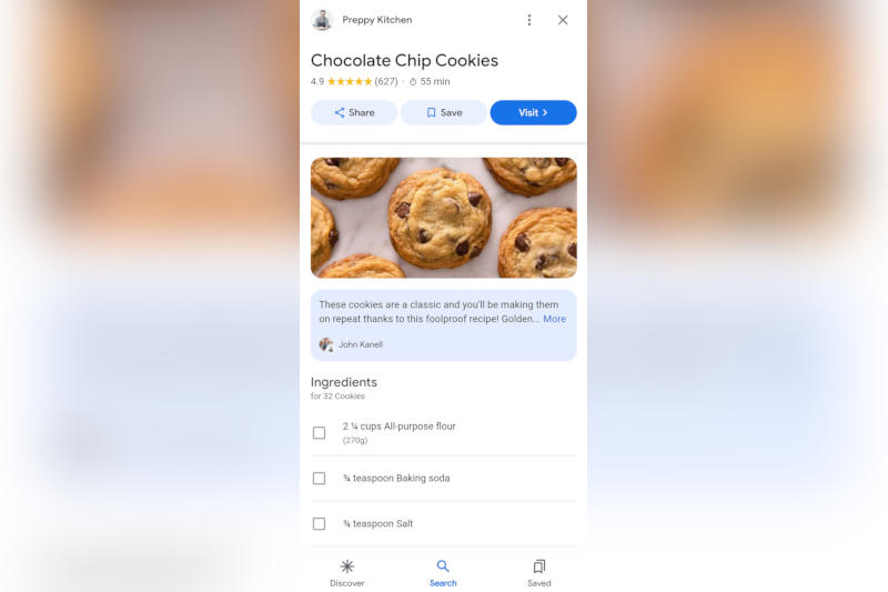 O recurso foi chamado de “Visualização Rápida” – alguns usuários começaram a ver um botão correspondente próximo a receitas individuais. Por exemplo, quando você pesquisa “receita de biscoito com gotas de chocolate”, este botão aparece ao lado de um link para uma página do popular blog Preppy Kitchen. Clicar no botão traz a receita completa com ingredientes, fotos e instruções passo a passo – sem sair da página de pesquisa do Google.
