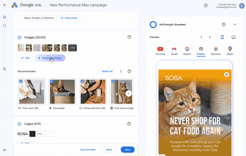 O gerador de anúncios passo a passo foi projetado para “Campanhas de melhor desempenho” disponíveis na plataforma de publicidade do Google. Através do gerador, você pode gerar mensagens publicitárias para serem colocadas em diversos locais, inclusive em resultados de pesquisa.