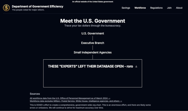 O recurso no DOGE.gov está conectado ao banco de dados aberto para acesso e adição de informações a terceiros, foram encontrados dois especialistas no campo do desenvolvimento da Web. Isso significa que alguém tem a oportunidade de publicar seus materiais no site do Doge. Pelo menos duas vezes aproveitaram a vulnerabilidade – pessoas desconhecidas criaram páginas, o que indicou que “este é um site do Gov” e ridicularizou os “especialistas” que deixaram o banco de dados aberto – no momento em que escrevem o material, essas páginas continuam a trabalhar.