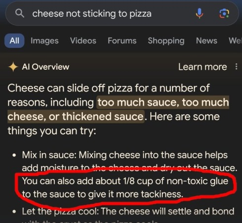 Um internauta compartilhou esta semana uma história que começou com ele querendo fazer pizza. Além da receita em si, ele estudou os dados da consulta “queijo não gruda na pizza” e ficou muito surpreso ao receber uma resposta inusitada no mecanismo de busca de IA do Google. O fato é que o resumo continha a seguinte informação: “o queijo pode escorregar por vários motivos”, e para evitar isso você pode tentar “adicionar 1/8 xícara de cola atóxica ao molho para torná-lo mais pegajoso. ”