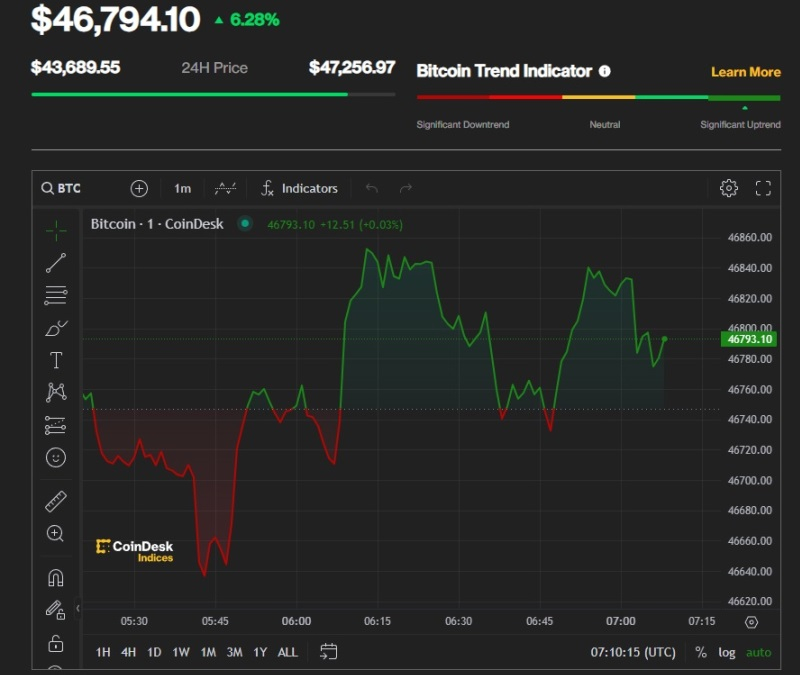 Ontem, a taxa do Bitcoin ultrapassou US$ 47.000 pela primeira vez desde abril de 2022. Isso ocorre em meio às expectativas de que a Comissão de Valores Mobiliários dos EUA (SEC) aprovará o lançamento do primeiro fundo negociado em bolsa (ETF) Bitcoin à vista. No momento em que escrevo esta nota, o custo da criptomoeda mais popular do mundo havia caído um pouco e era de cerca de US$ 46.800 por moeda (dados do CoinDesk).
