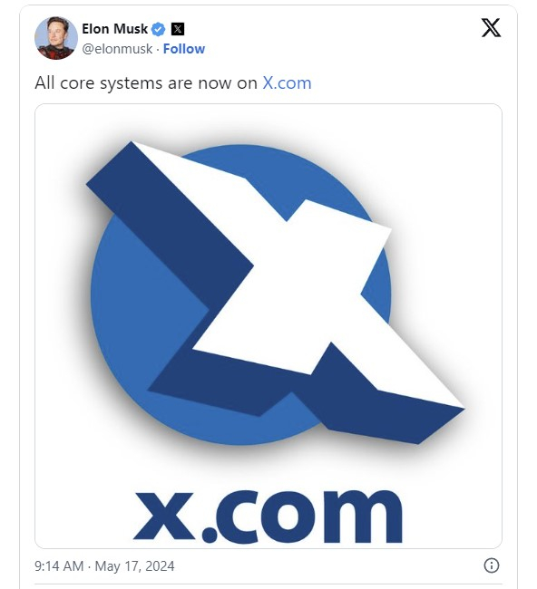 Musk tem uma longa história com o domínio x.com. Foi com este nome que abriu o seu segundo negócio em 1999 (o primeiro foi a Zip2, que vendeu à Compaq no mesmo ano de 1999). Após apenas um ano de operação, a X.com fundiu-se com a Cofinity, que possuía um serviço de transferência de dinheiro. Este serviço foi denominado PayPal. Musk serviu por vários meses como CEO da organização combinada, mas deixou o cargo devido a desentendimentos com outros executivos. O negócio combinado foi inicialmente denominado X.com, mas em 2001, após uma análise detalhada do feedback dos clientes, o nome da empresa mudou para PayPal. Em 2002, o PayPal foi adquirido pela Ebay Inc. por US$ 1,5 bilhão. Este acordo rendeu a Musk US$ 165 milhões. Em 2017, Musk comprou o domínio x.com. Segundo rumores, o negócio valia US$ 5 milhões.