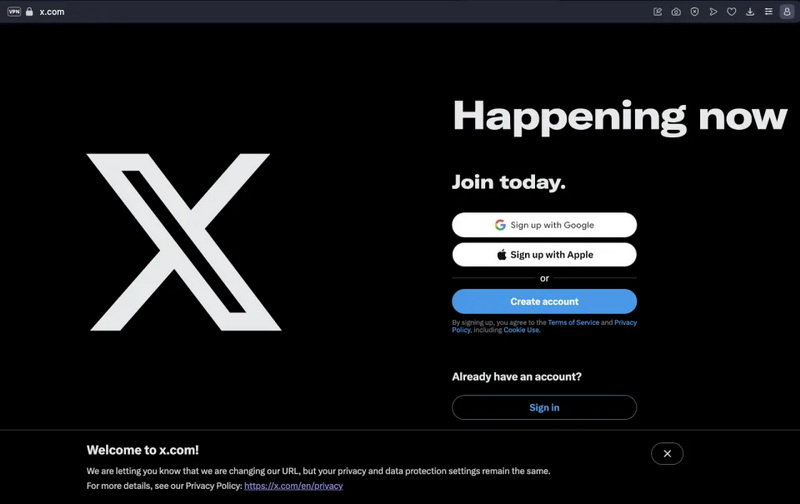 O Twitter foi renomeado como X em julho de 2023, mas o endereço do site não mudou; Agora, os visitantes da página twitter.com são redirecionados para a página inicial do x.com, onde são recebidos com a seguinte mensagem: