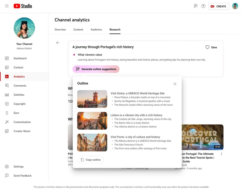 Um novo recurso alimentado por IA no YouTube Studio irá gerar ideias e designs para vídeos em potencial. Os criadores de conteúdo receberão recomendações personalizadas com base no conteúdo que é popular entre seu público. Além disso, o algoritmo poderá, a partir de uma consulta de texto, selecionar a música para um vídeo de acordo com sua descrição.