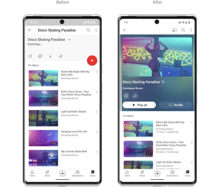 Algumas das mudanças de design incluem um botão de inscrição redesenhado, miniaturas de vídeo arredondadas e muito mais. Os botões Curtir, Compartilhar e Baixar agora são menores. Os links na descrição do vídeo foram substituídos pelos botões correspondentes.
