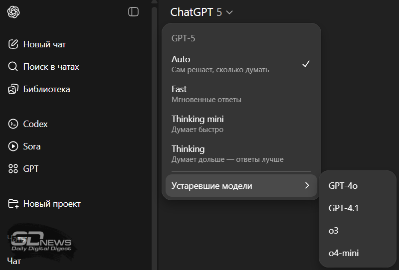 Agora, todos os usuários do ChatGPT têm acesso a um menu com três modos do GPT-5: Automático, Rápido e Pensamento. O primeiro modo permite a seleção automática do modelo, o segundo alterna o chatbot para o modo de resposta rápida e o terceiro para o modo de raciocínio. Para usuários de planos pagos, a empresa retornou a possibilidade de escolher entre modelos considerados obsoletos, incluindo GPT-4o, GPT-4.1 e o3. Ao mesmo tempo, o GPT-4o está disponível imediatamente no menu de seleção de modelos, e os demais devem ser adicionados nas configurações do serviço.