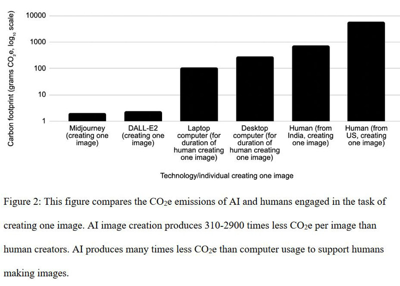 Os pesquisadores observaram que as emissões na resolução de problemas com a rede neural DALL-E2 são semelhantes às do ChatGPT e equivalem a cerca de 2,2 g de CO2 por solicitação. A rede neural Midjourney, que cria imagens com base em descrições de texto, tem um valor menor – 1,9 g de CO2 por solicitação. Os pesquisadores sugerem que “a criação de imagens com tecnologia de IA gera de 310 a 2.900 vezes menos emissões de CO2 por imagem do que a criação humana”.