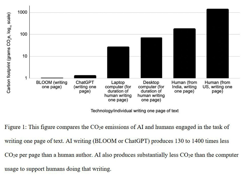 Os autores do estudo da Universidade da Califórnia em Irvine, do Instituto de Tecnologia de Massachusetts, da Faculdade de Direito da Universidade do Kansas e de outras organizações compararam as emissões de CO2 de sistemas de IA e humanos durante atividades semelhantes, com base nas emissões por pessoa nos Estados Unidos e Índia, e a energia gasta na fase de treinamento de IA, bem como para o sistema de IA completar a tarefa especificada na solicitação.