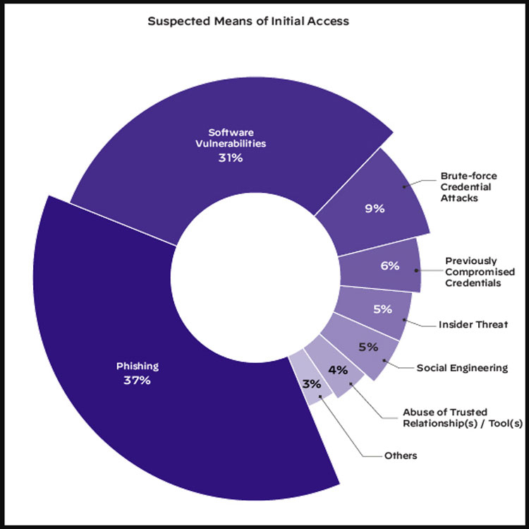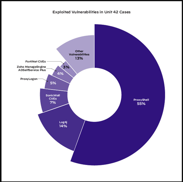 Uma análise dos métodos de ataque também forneceu uma imagem interessante. O relatório afirma que, no primeiro semestre de 2022, as vulnerabilidades de acesso ao sistema mais exploradas foram a cadeia de exploração ProxyShell, que representou 55% de todos os hacks relatados. O ProxyShell é um ataque que combina três vulnerabilidades: CVE-2021-34473, CVE-2021-34523 e CVE-2021-31207.