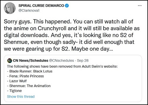 De acordo com o tweet CN News/Schedules mais tarde confirmado de DeMarco, Shenmue the Animation está deixando os catálogos Adult Swim e HBO Max. O show permanecerá no Crunchyroll e estará disponível para download.