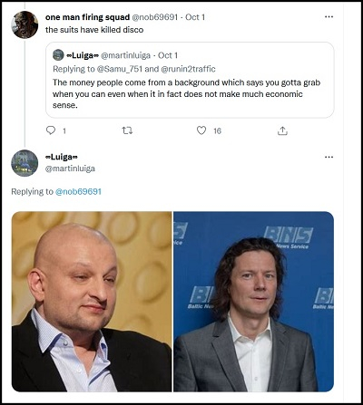 Em resposta a um comentário do usuário, “Homens de jaqueta mataram a discoteca”, Luiga anexou fotos dos produtores executivos do Disco Elysium, Kaur Kender e Tõnis Haavel.