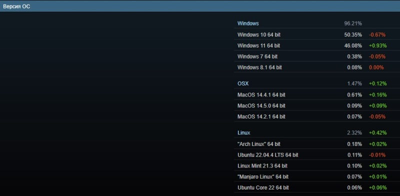 O Windows continua a ser a plataforma de software mais popular entre os usuários do Steam. Ao mesmo tempo, o Windows 10 está instalado nos PCs de 50,35% dos usuários da plataforma. A participação do Windows 11 continua a crescer, em maio aumentou 0,93 pontos percentuais. e totalizou 46,08%. O Linux demonstra um crescimento impressionante: em maio, a participação de PCs com este SO aumentou de 1,9% para 2,32%. O Steam continua hospedando jogos para Mac, razão pela qual o número de usuários de dispositivos Apple OS está crescendo. No mês passado, a parcela de PCs rodando macOS Sonoma aumentou para 1,47% (aumento de 0,12 pontos percentuais).