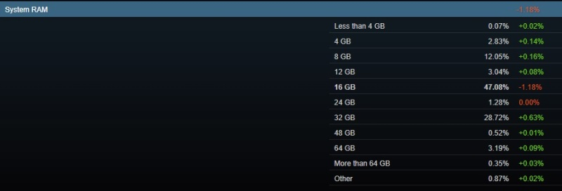 A maioria dos usuários do Steam (47,08%) ainda usa computadores com 16 GB de RAM. Embora os proprietários de PCs com 32 GB de RAM ainda estejam significativamente atrás (28,72%), seu número cresceu 0,63 pontos percentuais (pp) ao longo do mês. No mesmo período, o número de PCs com 16 GB de RAM diminuiu 1,18 pontos percentuais. Isso indica que uma parte dos usuários do Steam atualizou seus PCs para 32 GB ou mais de RAM em maio. Ao mesmo tempo, a participação de dispositivos (1,28%) com 24 GB de RAM permaneceu inalterada.