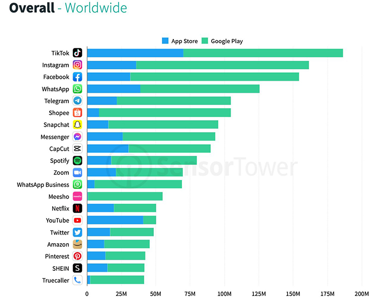 Um alinhamento semelhante no ranking dos cinco aplicativos mais populares é observado em relação aos downloads da App Store para proprietários de iPhone e iPad nos últimos três trimestres. O TikTok ultrapassou 70 milhões de downloads na App Store pela terceira vez no primeiro trimestre de 2022, impulsionado por um aumento de 11% em relação ao trimestre anterior na Ásia. Apesar de ter sido banido na Índia, um dos maiores marketplaces de aplicativos do mundo, o TikTok ficou em terceiro lugar em termos de downloads totais na Ásia, onde é o número 1 na App Store e o número 7 no Google Play.