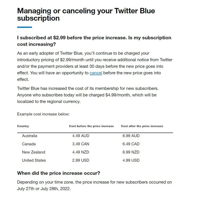 Enquanto a maioria das pessoas usa a rede social Twitter gratuitamente, no ano passado uma assinatura do Twitter Blue foi introduzida para alguns países, fornecendo recursos adicionais para quem está disposto a pagar US$ 2,99 por mês nos EUA, em outros países os preços são calculados em moedas locais. Os assinantes receberam agora uma mensagem de que o preço subiu para US$ 4,99.