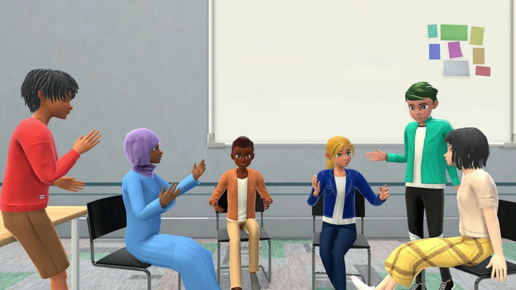 A solução UNIVERSE oferece espaços virtuais como salas de aula, auditórios e salas de colaboração. Os alunos podem interagir uns com os outros usando avatares personalizados. Ao controlá-los, os alunos se movimentarão e se comunicarão com os colegas em um ambiente digital seguro, desenvolvendo importantes vínculos interpessoais. Toda a comunicação ocorre em bate-papos individuais e em grupo usando emoji e som surround realista.