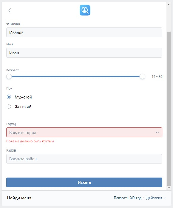 Para pesquisar, basta preencher as colunas com o nome, sobrenome de uma pessoa, sua idade aproximada e outros dados, seja cidade ou distrito de residência. Embora o serviço tenha sido desenvolvido pela própria plataforma VKontakte, ainda não se sabe como é melhor do que pesquisar na própria rede social usando vários filtros, com exceção de que agora você pode pesquisar na rede Odnoklassniki.