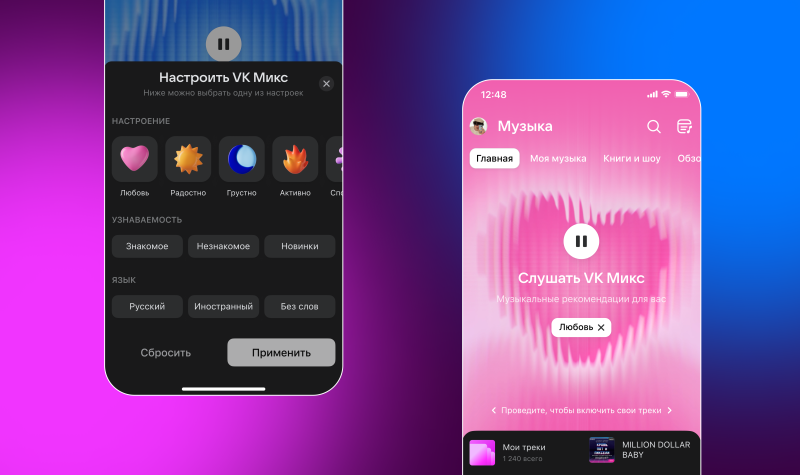 Os desenvolvedores melhoraram o sistema de recomendação do serviço; ele ficou mais preciso e rápido. Os algoritmos do sistema de recomendação se adaptam ao gosto do usuário após ouvir diversas músicas e reagir a elas. Graças a essa melhoria, os usuários têm 40% mais chances de adicionar faixas do VK Mix às suas playlists. Além disso, os usuários agora podem personalizar o fluxo de recomendações de acordo com seu humor – as opções disponíveis são “ativo”, “triste”, “calmo”, “feliz” e “amor”. Também é possível ouvir recomendações baseadas no seu reconhecimento e na linguagem do intérprete.
